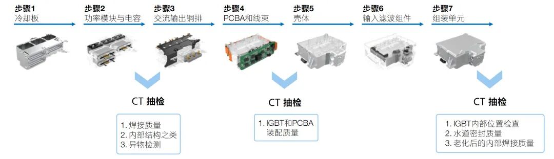 ▲ 加强全生产周期中动力汽车电子器件的质量控制 随着汽车的电气化的发展和汽车动力电子组件结构的复杂化、高度集成化,汽车电子器件的体积减小的同时,其输出功率仍在提升,产品的可靠性变得越来越重要。在电驱系统多合一的发展趋势下,功率模块对于紧凑化设计中散热的要求越来越严苛,许多车企为了提升新能源汽车电驱系统的功率密度,也在考虑升级功率模块的散热技术。而功率模块的焊接工艺质量直接影响了其散热和电流传输性能。高集成化的模块中涉及的焊接工艺精密复杂,并且容易受到生产环境影响。制造商需要检测其焊接封装工艺确保零件交付质量。 动力汽车电子器件的装配遵循线性生产过程,大部分组件由供应商提供并按顺序装配。来料检验只能验证装配前零件的交付质量,而在组装过程中可能会出现新的问题。因此,有必要在每个关键工序旁增加检测工序,以确保生产的稳定性。