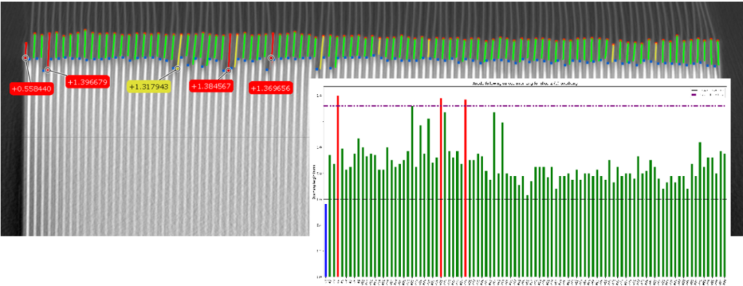 手动测量极片对齐度已远远满足不了当前电池的生产节拍,因此我们结合目前火热的深度学习方法来训练AI模型,从而支持为客户定制电池极片对齐度的自动分析和测量模块,也就是接下来会介绍到的电池对齐度自动测量模块,可以自动测量每组极片的对齐度,用色差图的形式展现测结果, 以及异常极片的位置。