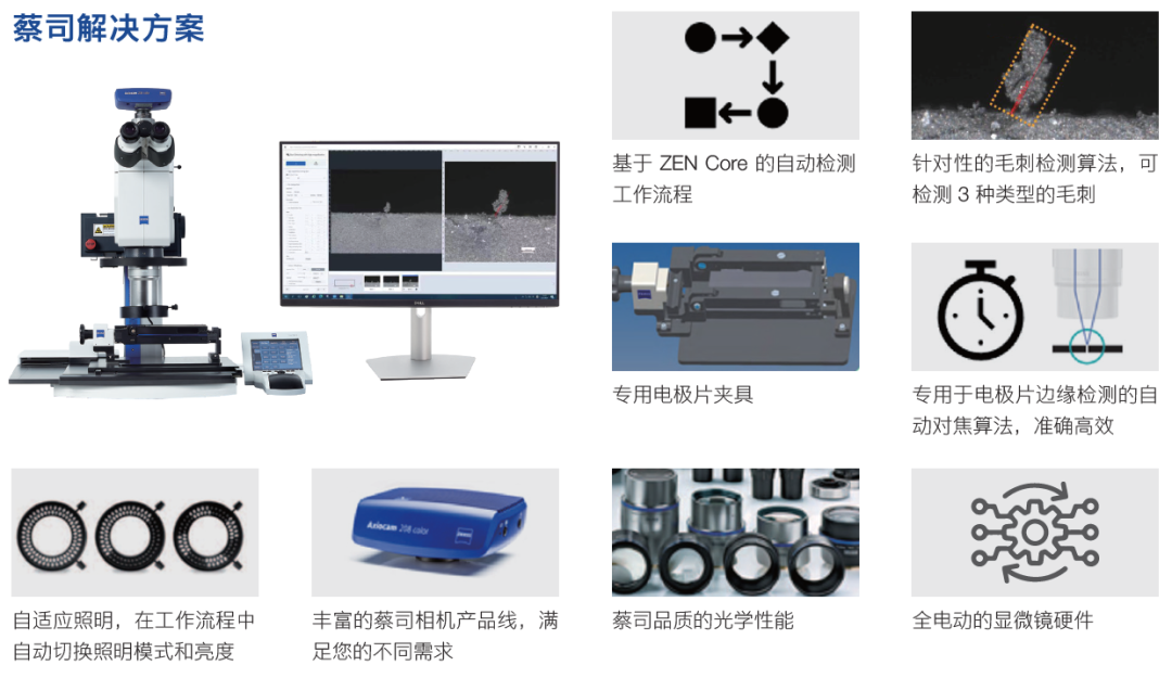 随着新能源技术的快速发展,电池作为核心组件,其安全性与性能优化一直是行业关注的焦点。电芯极片是电池构造的基石,其制造过程中的每一个细节都直接关系到电池的整体表现与安全性。特别是在集流体经过活性材料涂敷和辊压之后,需要进行分条和模切以得到符合设计尺寸的极片,在此过程中产生的毛刺或其他缺陷会影响电池的性能,增加内部短路风险,成为影响电池安全性能的一大隐忧。 毛刺:电池安全的隐形挑战者 毛刺,即电池极片在分条或模切后,在在电池极片箔材边缘产生的尖锐金属突起。这些不易察觉的锐利边缘,在电池的正常使用过程中,可能会与电芯壳体搭接,使壳体产生电化学腐蚀而导致电解液泄露引发电池包绝缘异常;更有甚者,可能会刺穿极片之间的隔膜,使正负极搭接短路导致电芯放电异常甚至热失控。 因此,对极片进行全面而细致的毛刺检测,能够及早发现潜在的安全隐患和性能问题,不仅是防范于未然的必要之举,更是提升电池整体可靠性和使用寿命的关键环节。检测的准确性和及时性,直接关系到电池的质量控制的严格度和安全管理的有效性,是确保每一块电池都能安全、高效服务于各类应用场景的重要保障。 ▲ 极片端面毛刺 ▲ 极耳激光模切熔珠 传统挑战:显微镜下的微观世界 为了有效控制毛刺,电池制造商通常使用光学显微镜等仪器进行检查、分析和测量。IEEE 1625标准的第5.3.6.2节建议测量毛刺并将其与隔膜厚度公差限值进行比较。一般毛刺控制的原则是其尺寸不超过隔膜厚度公差下限的50%。但这一过程充满挑战,电池极片边缘的形貌复杂,尤其是极片端面尺寸较小,仅有几十个微米,且在显微镜下的微观形貌不规则,人工检测毛刺需要检测人员具备极高的专业素养与经验积累,但仍然难以避免疏漏,难以满足大规模生产的需求,电池制造商往往需要投入更多的资源进行毛刺检测与控制。 ZEISS Axio Zoom.V16:精准高效,重塑检测标准 针对这一难题,蔡司推出了专门用于电池极片毛刺检测的数码显微镜解决方案。该方案基于先进的光学数码显微镜Axio Zoom.V16和以用户工作流程为导向的ZEN core软件,辅以极片夹持装置和毛刺识别算法。这一方案不仅准确度高、再现性好,而且检测效率出色,有效解决了客户在毛刺检测方面的痛点。 卓越光学性能 ZEISS Axio Zoom.V16毛刺检测方案采用专业平场复消色差远心物镜和800w像素的专业相机,可在56mm的大自由工作距离下,实现7x至112x光学放大倍率的连续调节。即使在1X的大视场物镜下,最高光学平面分辨率也可达到0.7μm。 智能识别算法 搭配一致的毛刺识别算法,可根据用户自定义设置毛刺识别标准,大幅提高了毛刺识别和测量的准确性,有效降低人为误差。同时,通过电动及编码组件和自动化软件工作流程,使每项检测任务均能在一致的显微镜硬件和检测软件的配置下完成,有效保证了检测的再现性。在相同任务的工作流程下,即使操作人员不同,也可获得相同的结果,大幅降低操作人员之间的结果偏差。 自动化工作流程 结合Zen core软件,操作人员只需启动检测流程,从扫描极片并采集图像,到识别和测量毛刺,再到生成检测报告,所有流程均自动完成,无需值守即可获得检测结果,帮助用户全面提升检测效率。 左右滑动查看更多>>> 灵活配置,满足多样化需求 为了满足用户多样化、个性化的使用需求,蔡司同时提供了一系列不同的产品组合,采用蔡司专利的手动工作台可兼容140mm*90mm的极片样品,搭配自动或半自动毛刺检测流程来使用;也可根据实际大尺寸极片定制大行程工作台,结合自动毛刺检测程序实现水平毛刺检测和端面垂直毛刺检测的自动切换。 ▲ 手动工作台 ▲ 大尺寸自动工作台 在新能源电池质量与安全性的征途上,毛刺检测是确保电池质量和安全的重要环节,采用ZEISS Axio Zoom.V16毛刺检测系统,将有助于提高毛刺检测的准确性和效率,构建了一道坚实的安全防线,为新能源电池的安全使用提供保障。